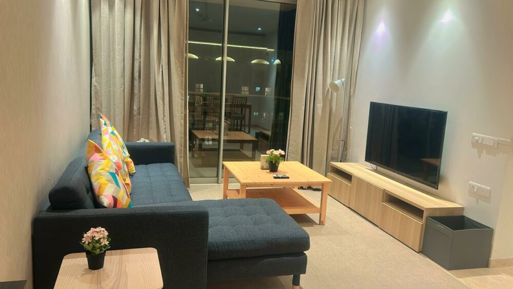 A beautiful residential complex with all modern amenities is the hallmark of the apartment location. A beautifully landscaped garden with a small walkway greets you just as you step out of the apartment lobby. Intercom and WiFi facilities are available. The living room is painted with beautiful pastel colors and is aesthetically illuminated. It has a plus 6 seater L shaped sofa with a glass-topped center table. The master bedroom contains a king-sized bed with plush mattresses and bed linen.  It also has a dressing table, 32 inch LCD TV and split air conditioner. A bathroom with modern fittings is attached to the bedroom.  The bath is just opposite to the bedroom. The modern kitchen is modular and well equipped with a gas burner with overhead chimney, 2 door refrigerator, microwave oven, and a front-loading fully automatic washing machine.